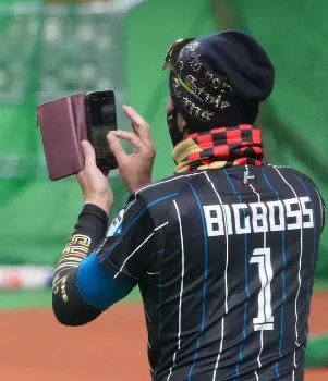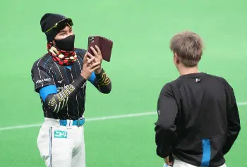 試合前練習でインスタライブを行う新庄監督(撮影・高橋茂夫)