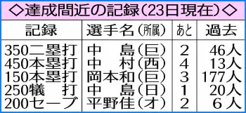 通算本塁打は歴代単独14位の446本。節目の450本塁打まであと4本に迫る。西武一筋21年目。1球団のみでプレーする選手をフランチャイズプレーヤーと呼ぶが、450本塁打以上では王貞治(巨=868本)、山本浩二(広=536本)、衣笠祥雄(広=504本)と3人だけで、パ・リーグにはいない。最近4試合は欠場しているが、疲労を考慮しての措置。チームの浮上に貢献する本塁打を期待したい。(記録課・宮入 徹)