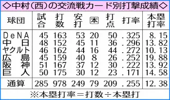 カード別ではDeNA戦が最もいい。打率・325、20本塁打、50打点はいずれもトップ。本塁打率(1本塁打に要する打数)は8・15。今週後半の27~29日に本拠でDeNA3連戦が予定される。