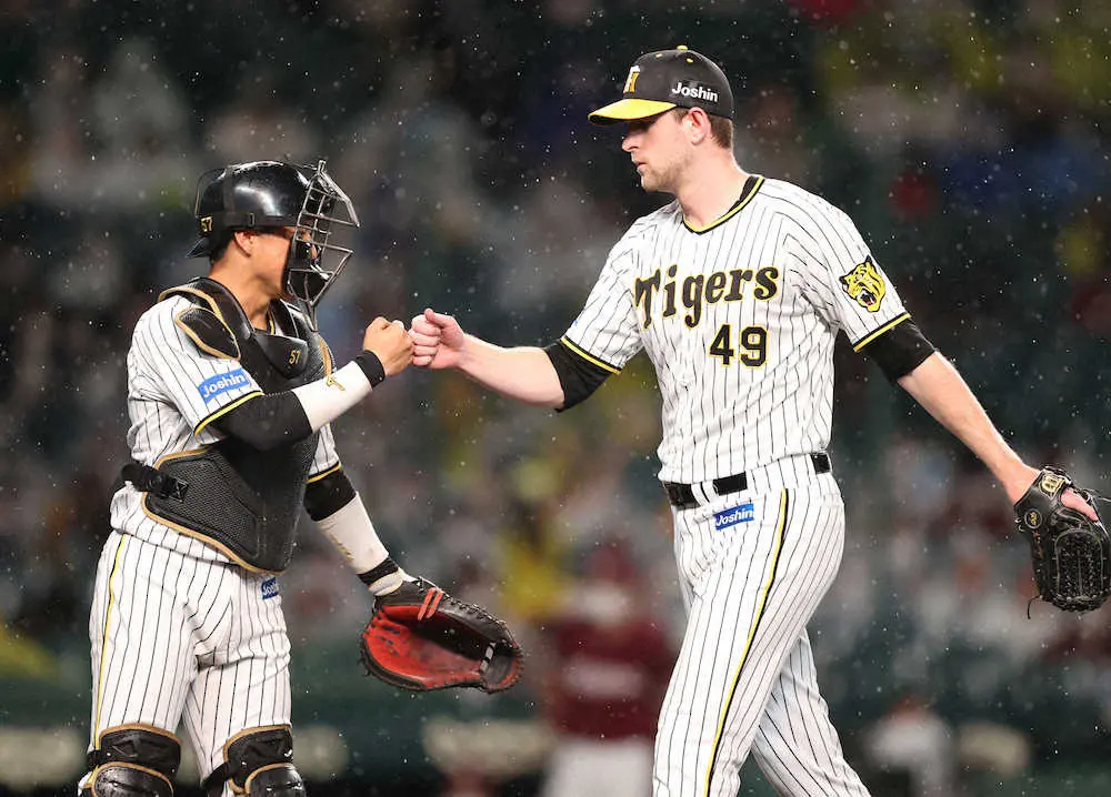 阪神・ガンケルは7回をちょうど100球で投げ切り、3安打無失点に抑えた。迫り来る雨雲とも戦い、打者1人平均3・8球と勝負を早め、敵地で6回2失点と粘った昨年6月13日に続く楽天戦での快投だった。