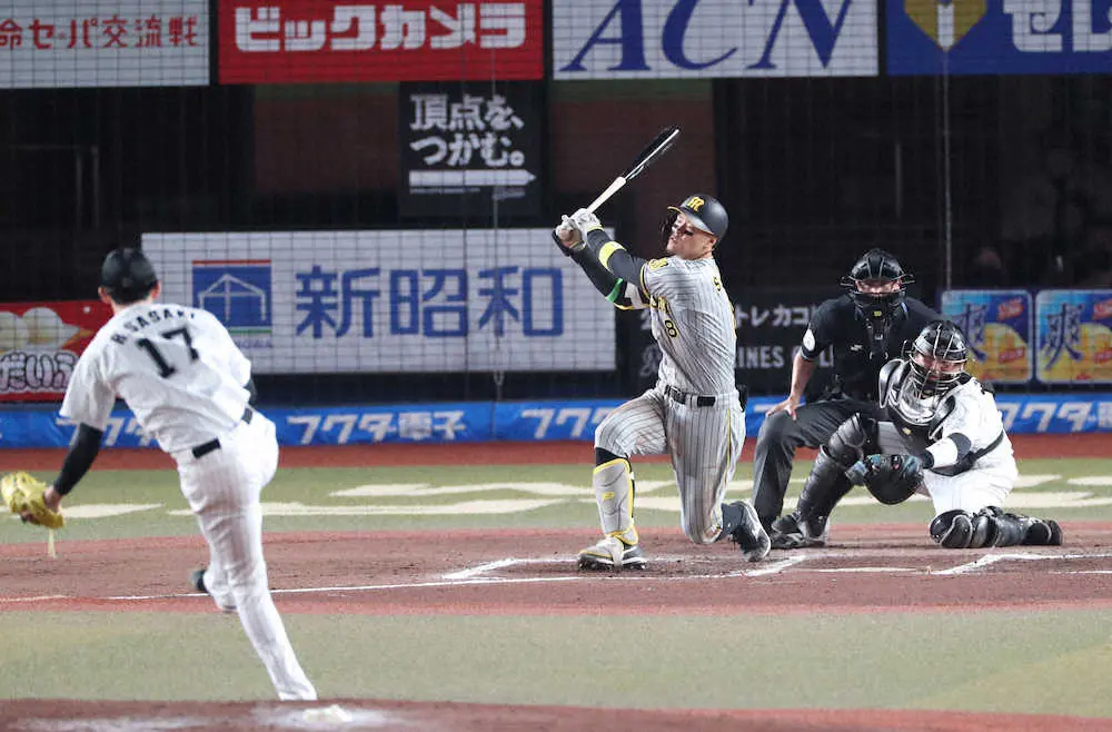 阪神・佐藤輝 朗希に悔しい2三振 2死三塁の好機で145キロフォークにバットが空を切る