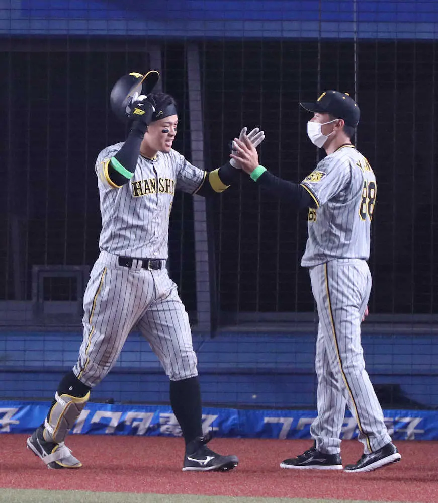 9回に飛び出した佐藤輝の虎の子の一発に、阪神・矢野監督も喜びを隠せなかった。見逃せばボールゾーンだった低めのシンカーをすくい上げて放った中越えソロに驚がくしながらも、真っ先にベンチを出てハイタッチで出迎えた。