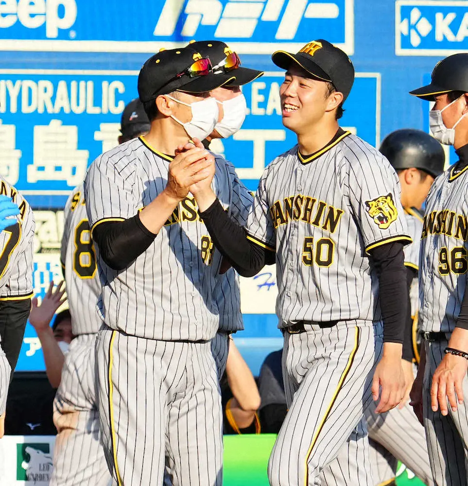 <ロ・神>笑顔で矢野監督とタッチする青柳(撮影・長久保 豊)