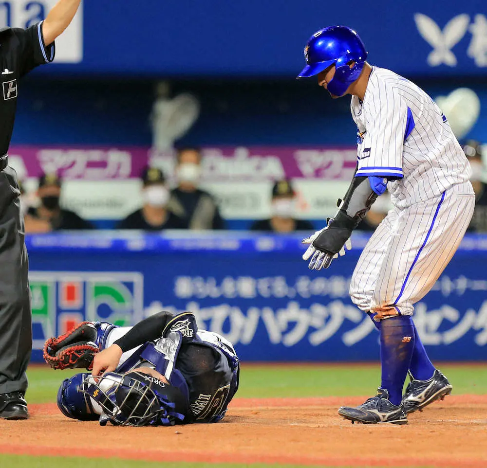 オリ・伏見にアクシデント DeNA・嶺井の空振りフルスイングが頭部直撃 担架で運ばれ負傷交代