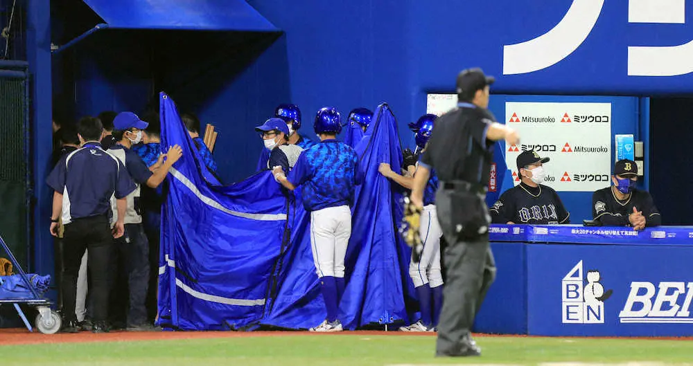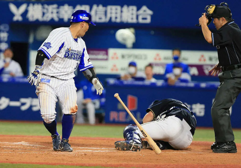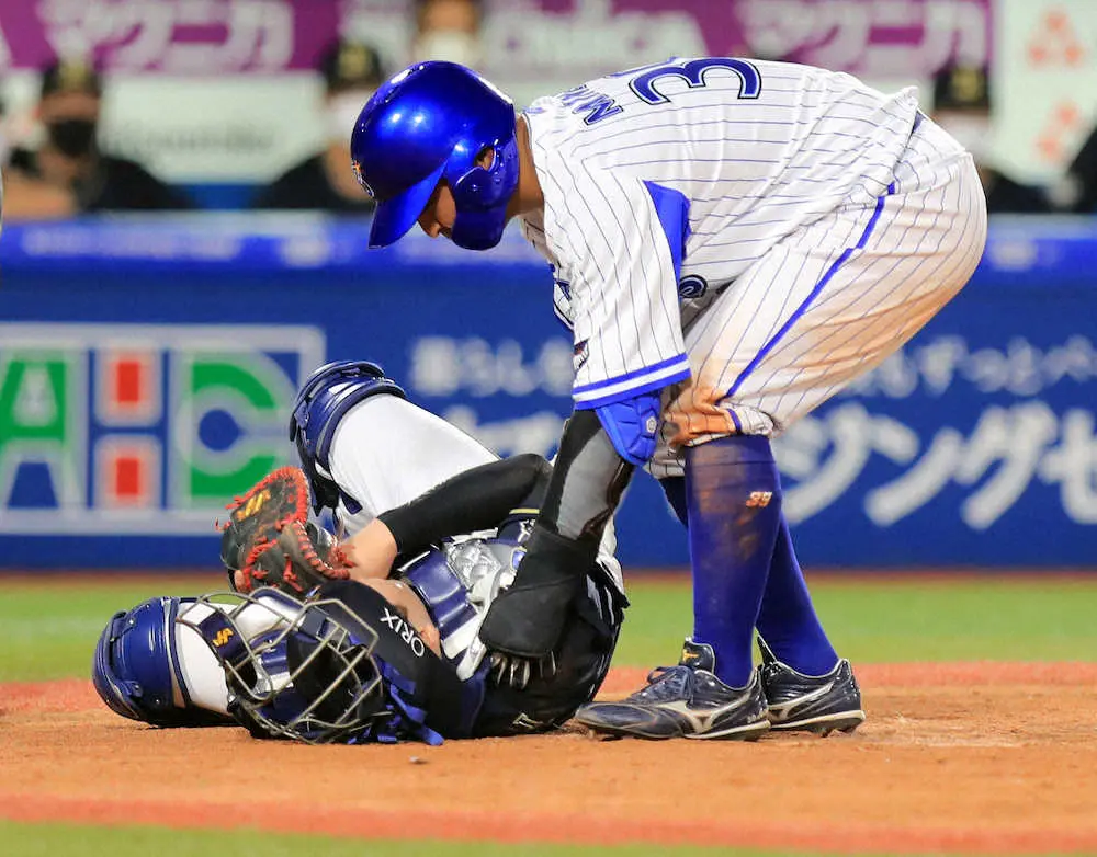 【画像・写真】オリ・伏見にアクシデント DeNA・嶺井の空振りフルスイングが頭部直撃 担架で運ばれ負傷交代