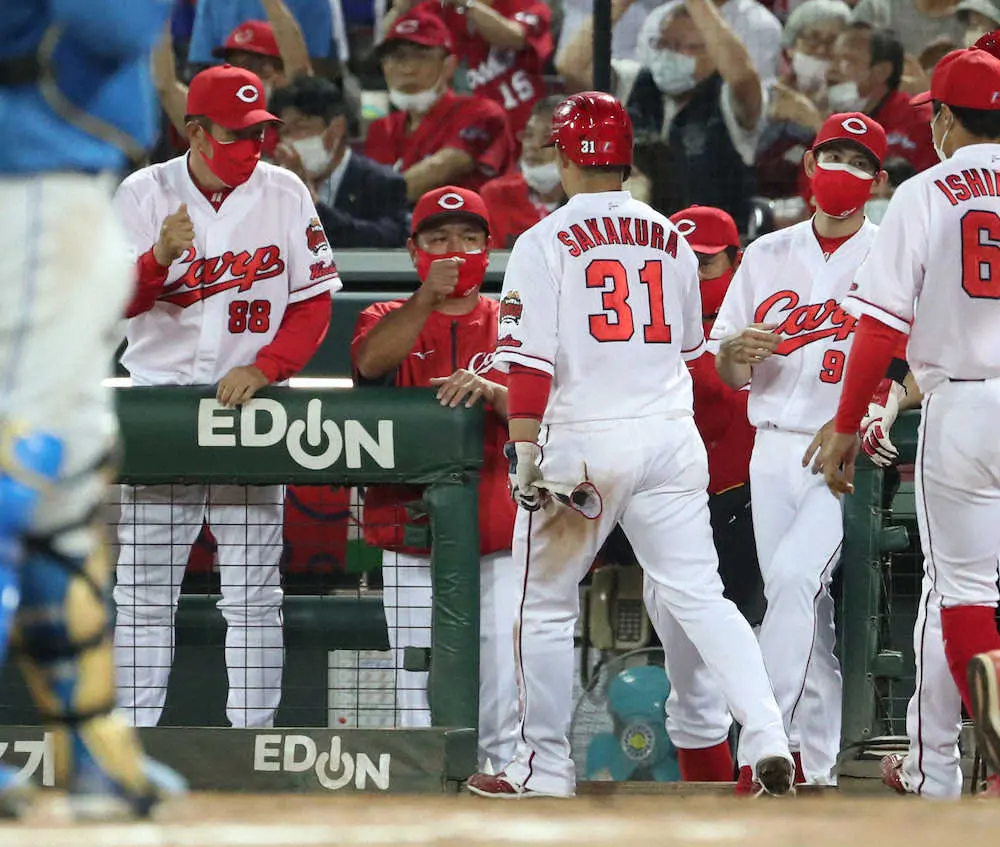 今季初の先発マスクだった中村奨が5回に二盗を阻止した直後に、空気が一変。その裏の攻撃で無死満塁とし、1死後にマクブルーム、坂倉が2者連続の押し出し四球を選んで勝ち越すと、宇草の押し出し死球で追加点を挙げた。そして、2死満塁から中村奨が走者一掃となる右越え二塁打を決めて一挙6点と逆転に成功した。