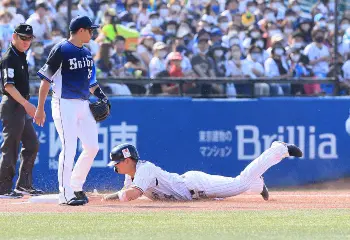 二塁を蹴りギアを上げた。最後は迷いなく頭から三塁へ滑り込む。村上が気迫のヘッドスライディング。「常に次の塁を狙って意識してやっています」。主砲の汚れたユニホームは、チームにとって何よりのカンフル剤だった。