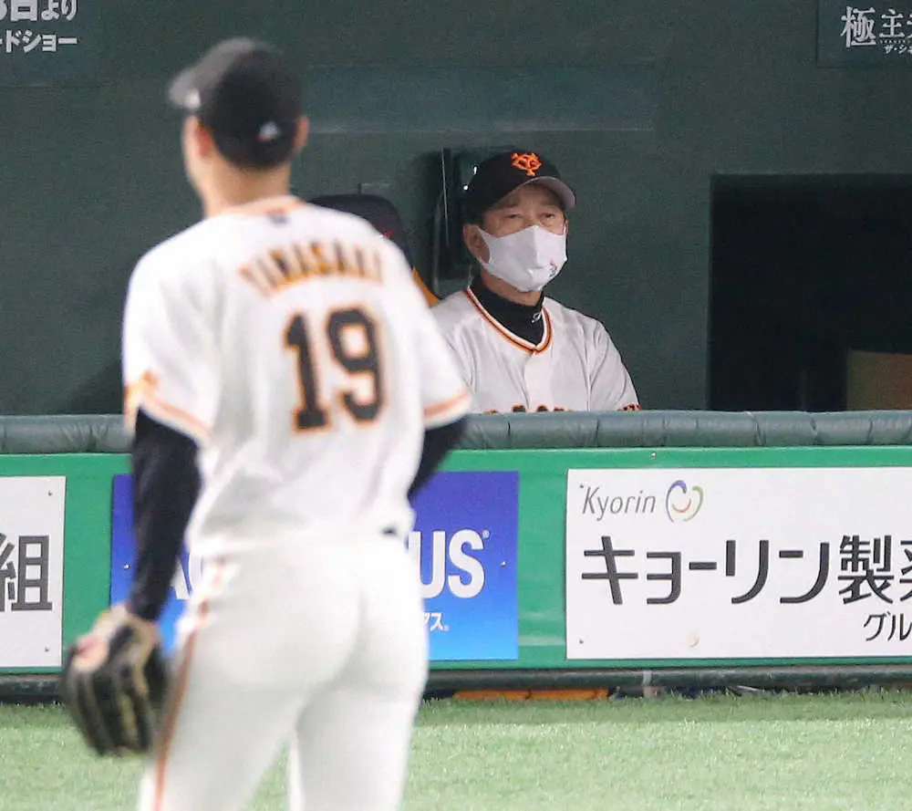 <巨・ロ>3回途中、降板となる先発の山崎伊。奥はベンチで険しい表情の原監督(撮影・河野 光希)