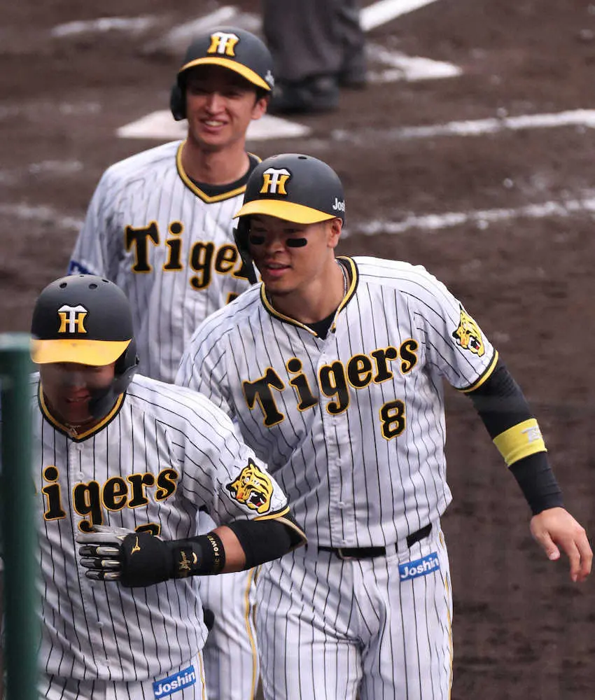 <神・日>3回、左越え3ランを放った大山(左)を迎える佐藤輝(8番)(撮影・坂田 高浩)