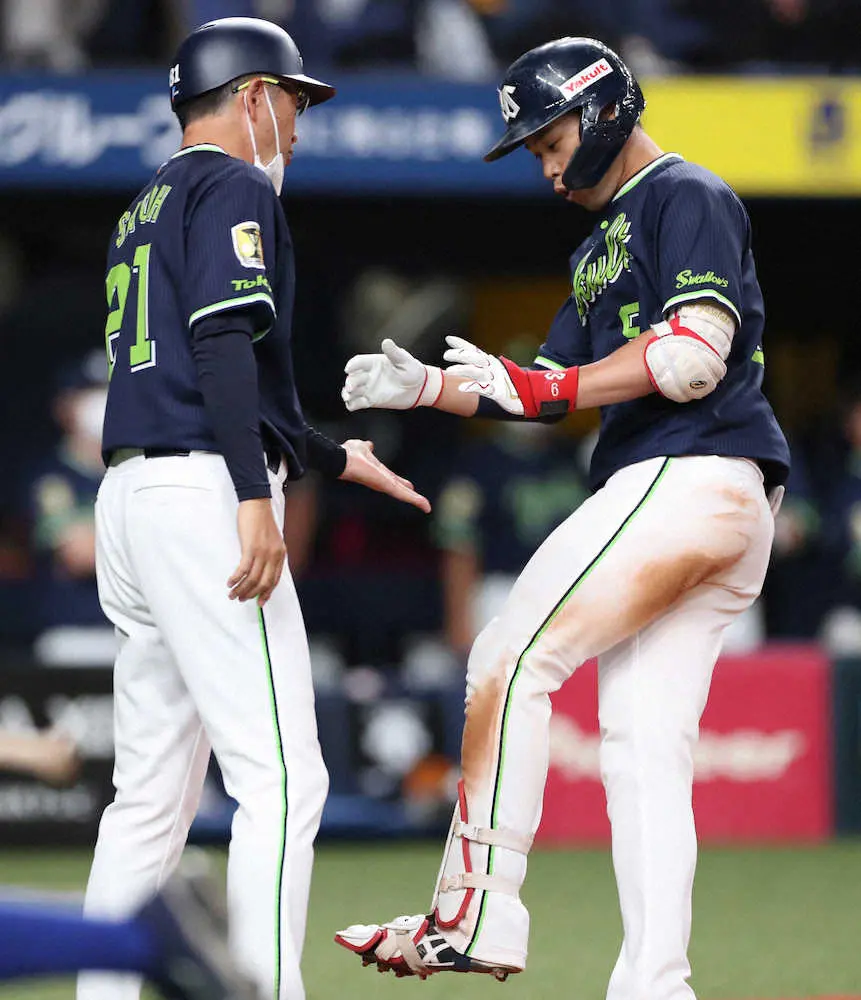 <オ・ヤ>9回2死、左越え本塁打を放った塩見(右)(撮影・平嶋 理子)