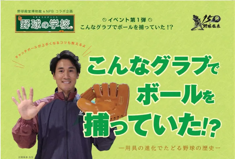 第1弾として7月10日に東京ドームシティのスポドリで「こんなグラブでボールを捕っていた!?―用具の進化でたどる野球の歴史―」を開催。野球が伝来した150年前から現在までのグラブや技術の進化を、講師役の元巨人・片岡保幸氏に90年前と同型のグラブを使ってもらい紹介していく。また参加した子供にもこのグラブを使って、キャッチボールを体験してもらう。