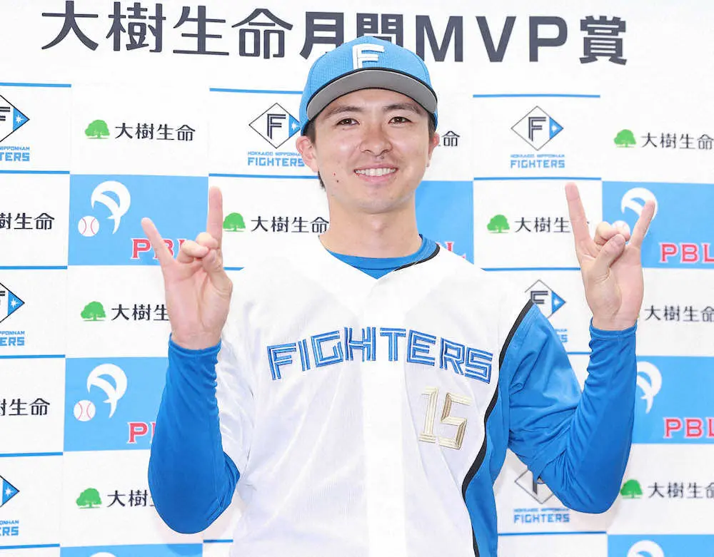 ◎5月度の月間MVP賞を受賞した日本ハム・上沢は写真撮影でカメラマンから話題の「きつねダンス」のポーズを求められ「これ、だいぶこすりますね」。もうしばらくお付き合いください。