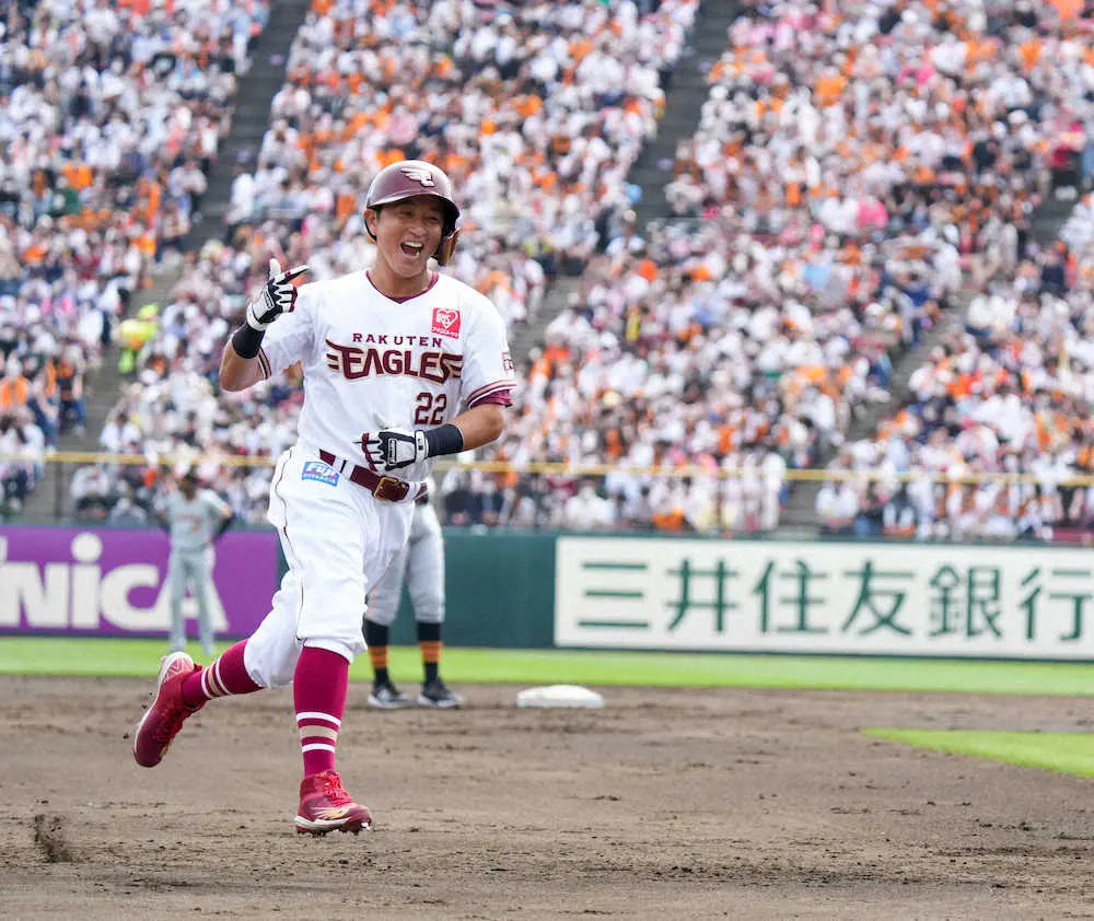 チーム最年長38歳の楽天・川島が、「初物尽くし」の初お立ち台で喜びを爆発させた。左キラーとして「8番・二塁」で本拠地初打席に立った0―0の2回2死二、三塁。左腕メルセデスの初球直球をフルスイング。ソフトバンクから移籍後初アーチを左翼席に運び、5月30日以来の首位奪回に導いた。