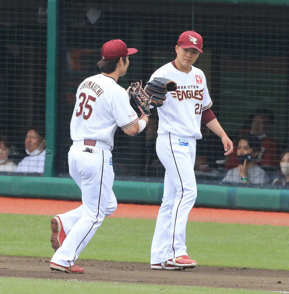 <楽・巨>6回を投げ終え、島内(左)とタッチを交わす早川(撮影・河野 光希)