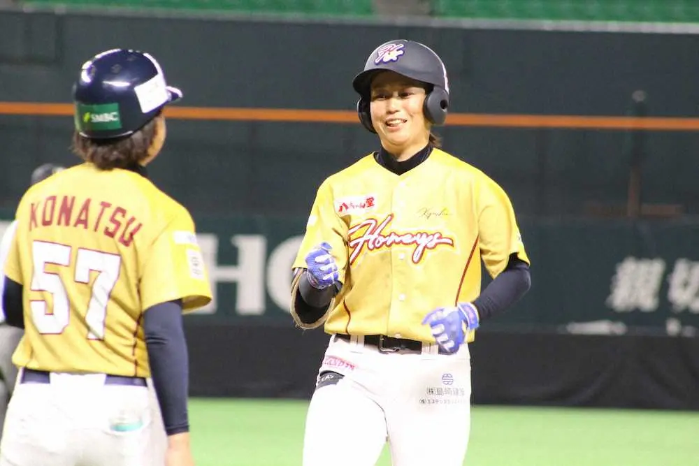 ソフトバンクのデーゲーム終了後のペイペイドームで、九州ハニーズナインが貫禄を見せつけた。主役は今年1月に楢岡とともにチームを創部した川端だった。初回無死一、三塁で先制の左前適時打を放つと、一塁ベース付近で小さくガッツポーズ。両親が観戦する中で躍動し、「ちょっとでもいいところを見せられたらと思った」と笑みを浮かべた。さらに楢岡、船越もタイムリーで続き、この回4得点。4回にも4点を加えるなど、8安打9得点で完勝した。