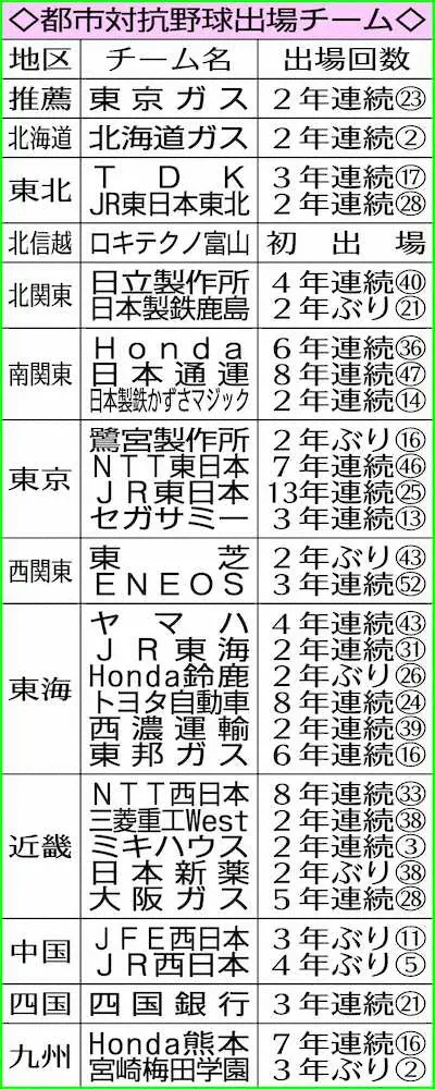 7・18開幕都市対抗32チーム出そろった!初出場はロキテクノ富山 ENEOSが最多52度目