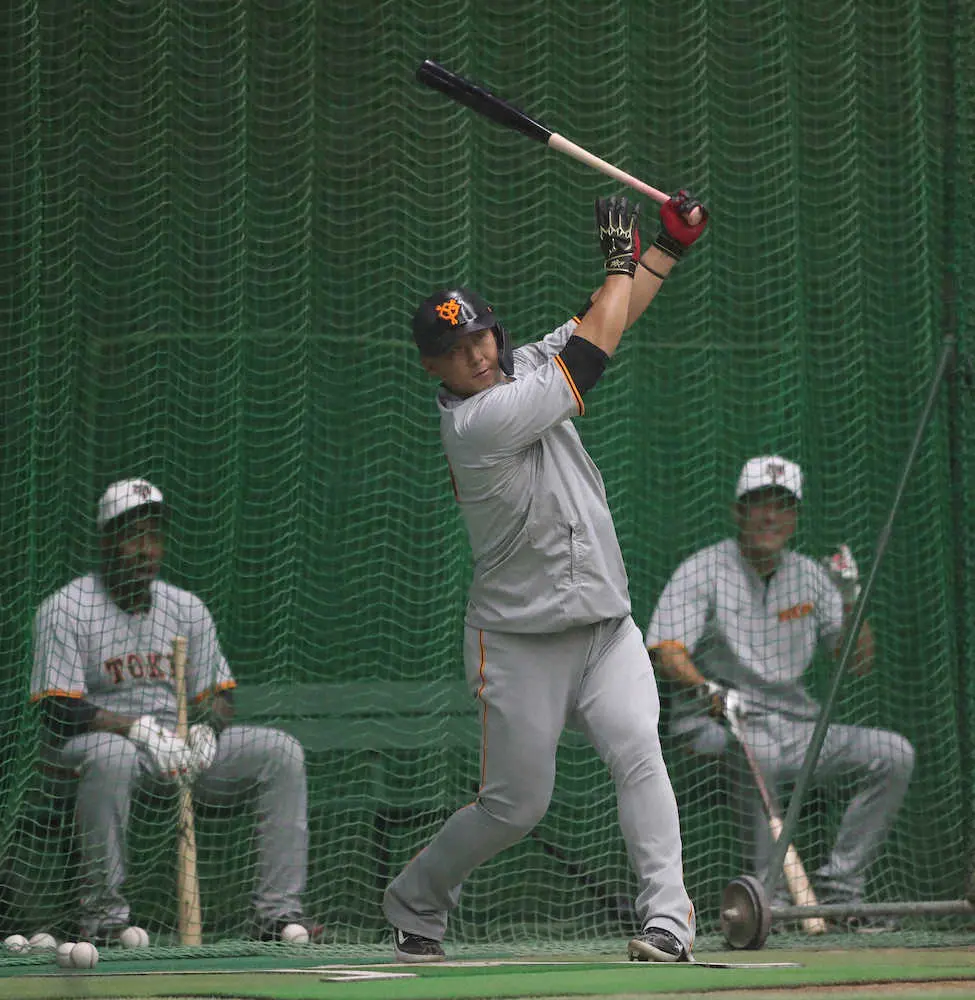 <巨人練習>ウィーラー(左)、坂本(右)の前で打撃練習をする中田 (撮影・光山 貴大)
