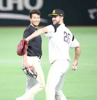 笑顔でキャッチボールするソフトバンク・レイ(左は千賀)(撮影・岡田 丈靖) Photo by スポニチ ソフトB・レイを中継ぎ待機 甲斐野を今季初昇格へ 17日から楽天と首位攻… ギャラリーで見る この記事のフォト 2022年06月15日の画像一覧 もっと見る 2022年06月15日の画像をもっと見る