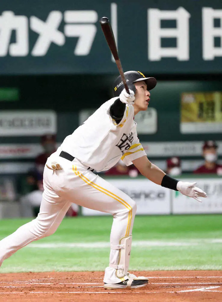 一発攻勢の先陣を切ったのは柳田だ。初回の第1打席。相手先発・田中将の143キロのスプリットを右手一本で弾き、泳ぎながらも右翼テラス席へ運んだ。交流戦は打撃不振にもがき、本塁打は5月22日のロッテ戦以来。田中将との対戦成績は試合前まで通算25打数8安打、打率・320で、相性通りに結果を残した。