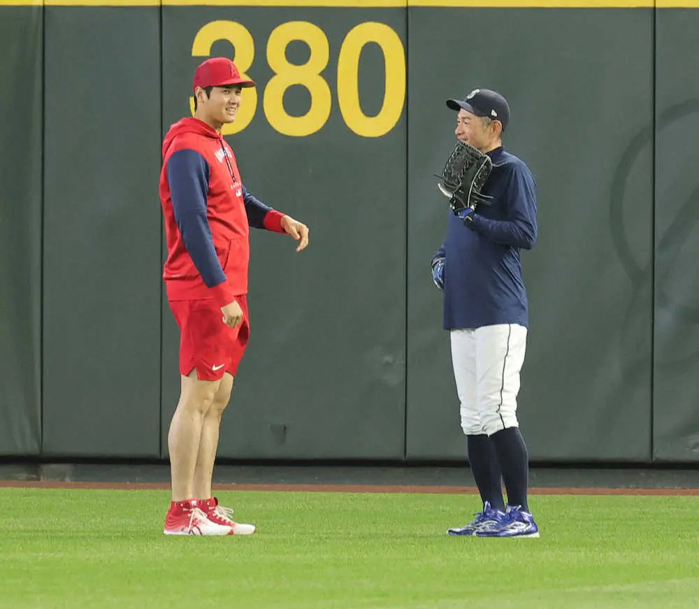 大谷 マリナーズ戦試合前にイチローさんにあいさつ、笑顔で話し込む 試合は4試合ぶりに先発外れる