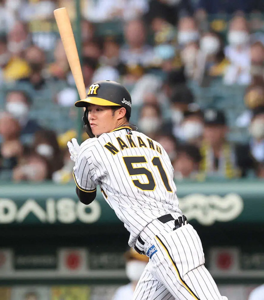 <神・D>初回、阪神・中野は左前打を放つ(撮影・大森 寛明)