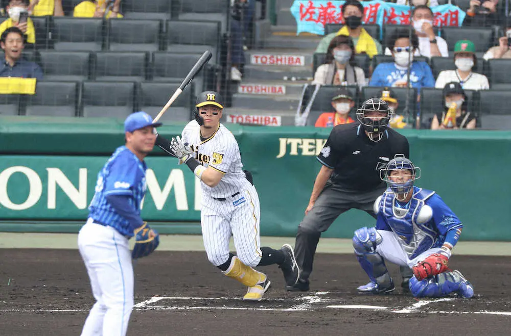中野の四球、近本の左前打で築いた好機。2球目、肩口から入ってきた甘いスライダーを一振りで仕留めた。文字通り、左中間を切り裂いた強烈な打球に、聖地のボルテージは一気に上昇した。
