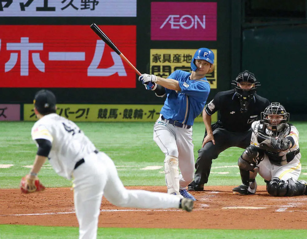 <ソ・日>2回、ソロを放つ日本ハム・浅間。投手・千賀(撮影・岡田 丈靖)