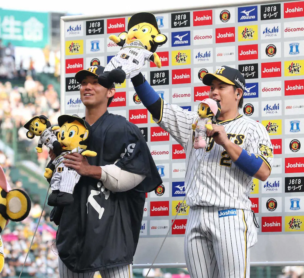 <神・中>ヒーローインタビューで「明日も勝つばい」とファンを盛り上げる梅野(右)と伊藤将(撮影・平嶋 理子)