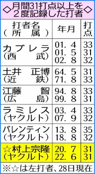 月間31打点を2度記録した打者 Photo by スポニチ ヤクルト・村上 最短30日M灯導く逆転3ラン 王&ゴジラ超え左打者初2度目… ギャラリーで見る この記事のフォト 2022年06月29日の画像一覧 もっと見る 2022年06月29日の画像をもっと見る