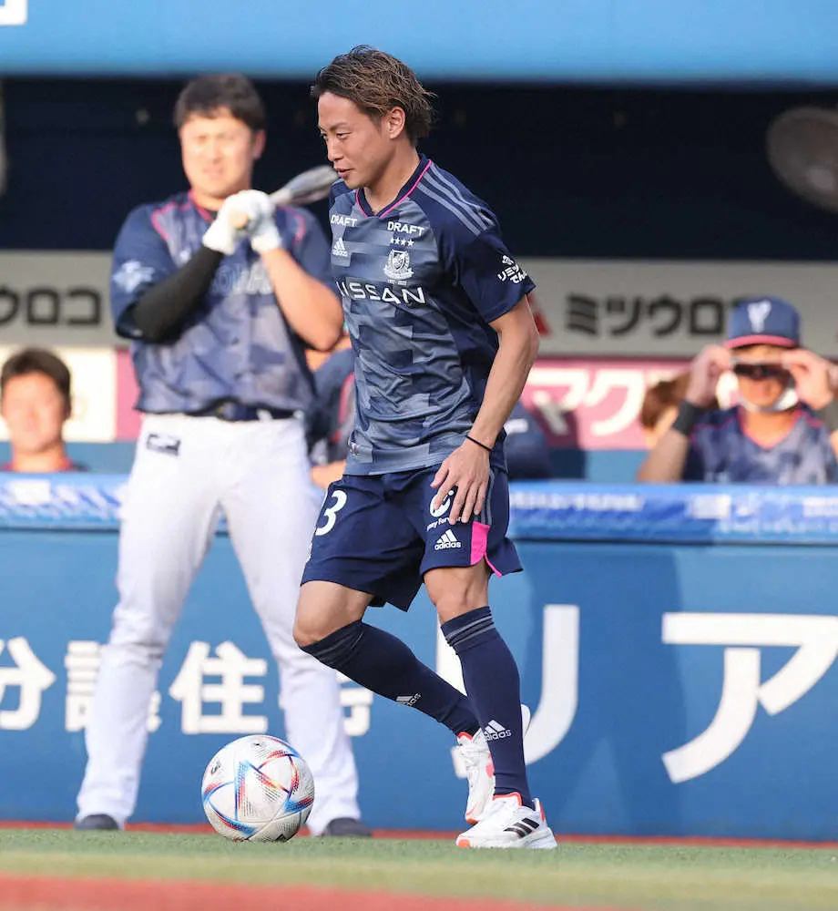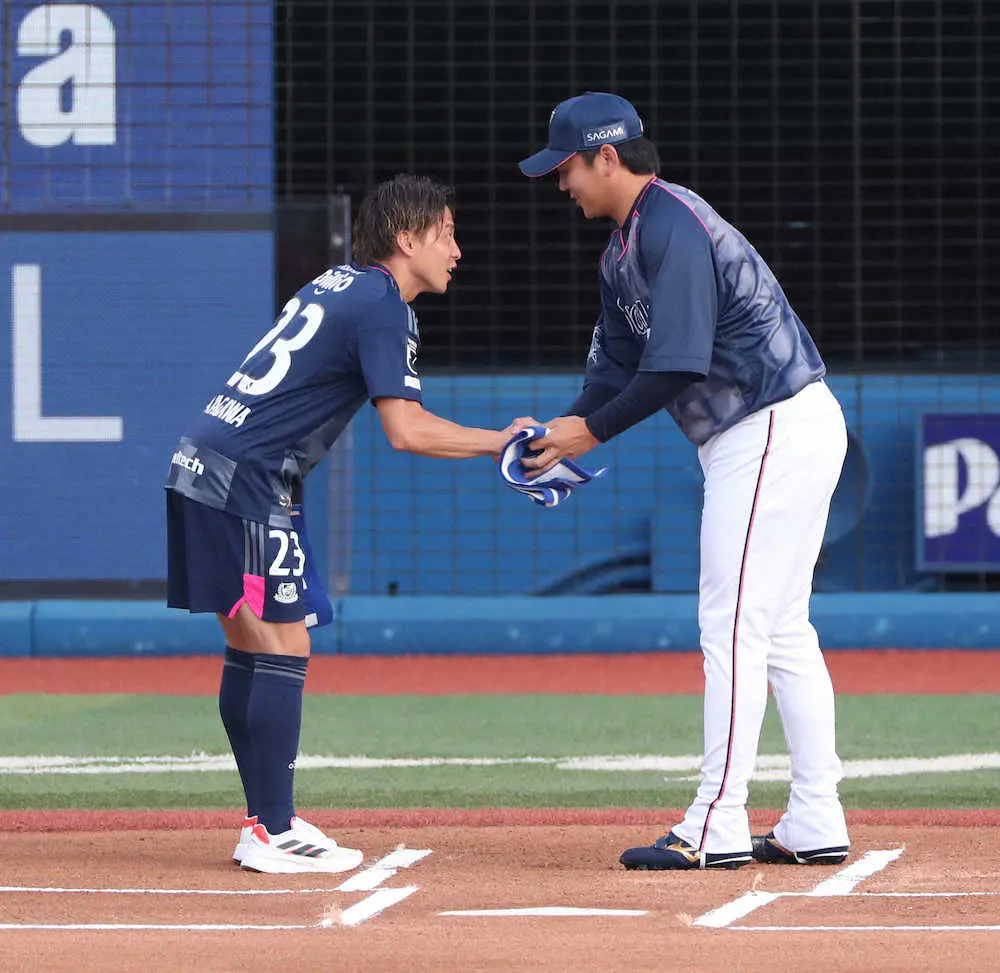 <D・神>始球式を終え打者を務めた山崎康(左)と握手を交わし引き揚げる横浜F・マリノスの仲川(撮影・会津 智海) Photo by スポニチ DeNAとのコラボイベント 横浜F・マリノスの仲川が速球を披露 ギャラリーで見る この記事のフォト 2022年06月29日の画像一覧 もっと見る 2022年06月29日の画像をもっと見る
