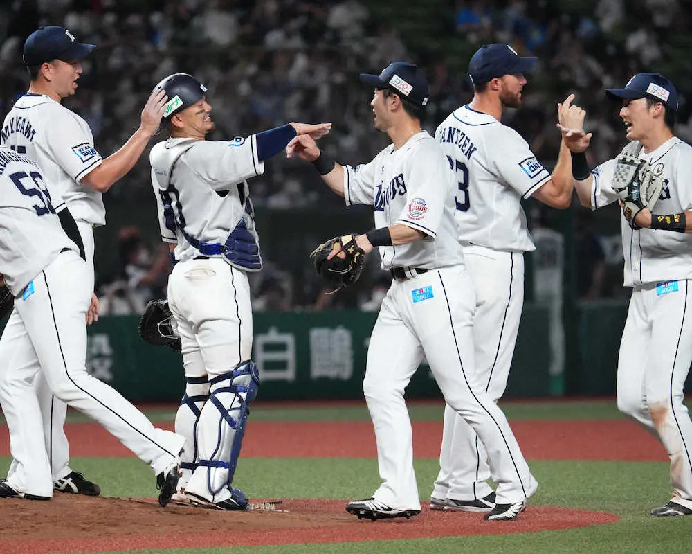 <西・日>初回を無失点で切り抜けチームメートに出迎えられる西武先発・エンス(撮影・尾崎 有希) Photo by スポニチ 西武5連勝で今季最多の貯金4 5回無失点も“緊急降板”エンスに5勝目届けた ギャラリーで見る この記事のフォト 2022年06月29日の画像一覧 もっと見る 2022年06月29日の画像をもっと見る