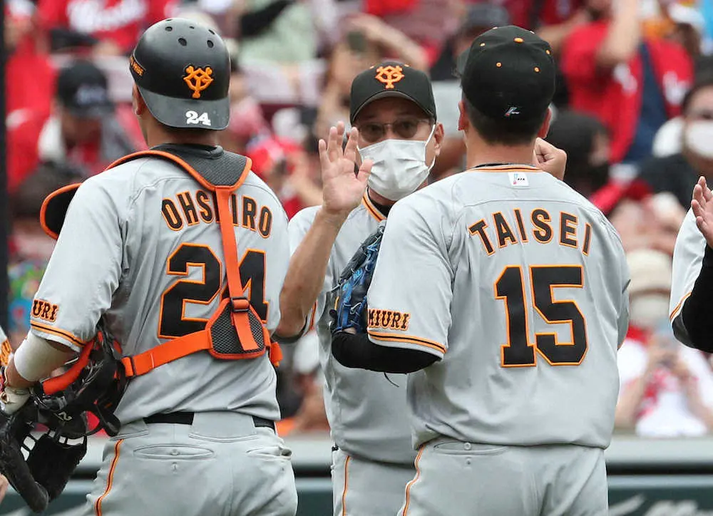 <広・巨>最後を締めた大勢(15)を迎える原監督(中央) (撮影・奥 調)