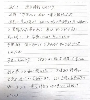 いつもどんな時も周りにはたくさんの人が居てくれて、助けてもらえて…この上ないことだもんね。投げられなくて辛かった日々は貴方のこれからの野球人生において何か意味がある事だと思うから。その苦悩の日々を忘れず力に変えてね。