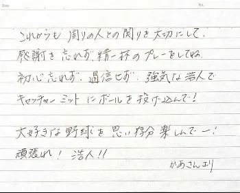 これからも周りの人との関わりを大切にして感謝を忘れずに精一杯のプレーをしてね。