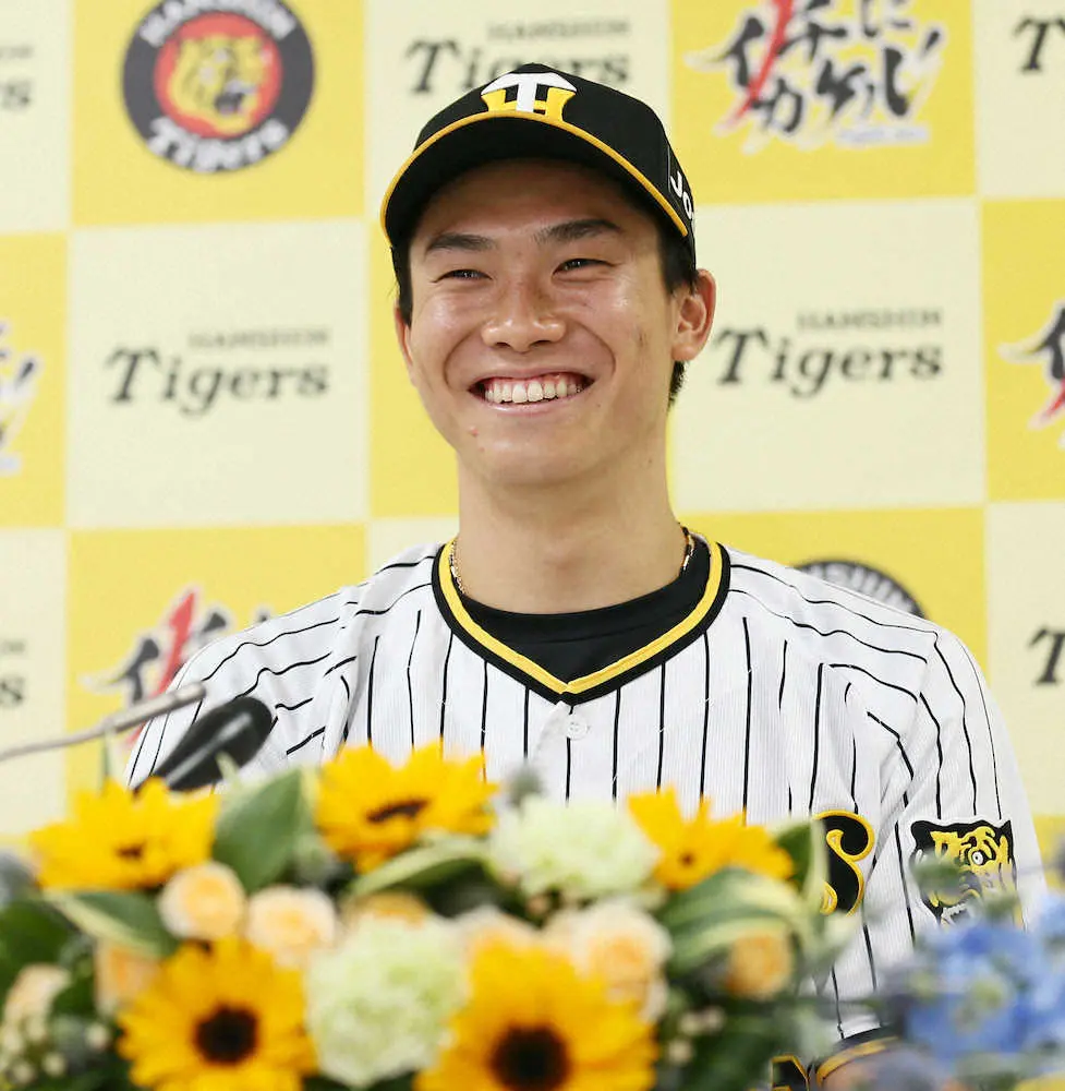 <阪神・オールスター選出者会見>初のオールスター出場が決まり、笑顔で会見を行う湯浅