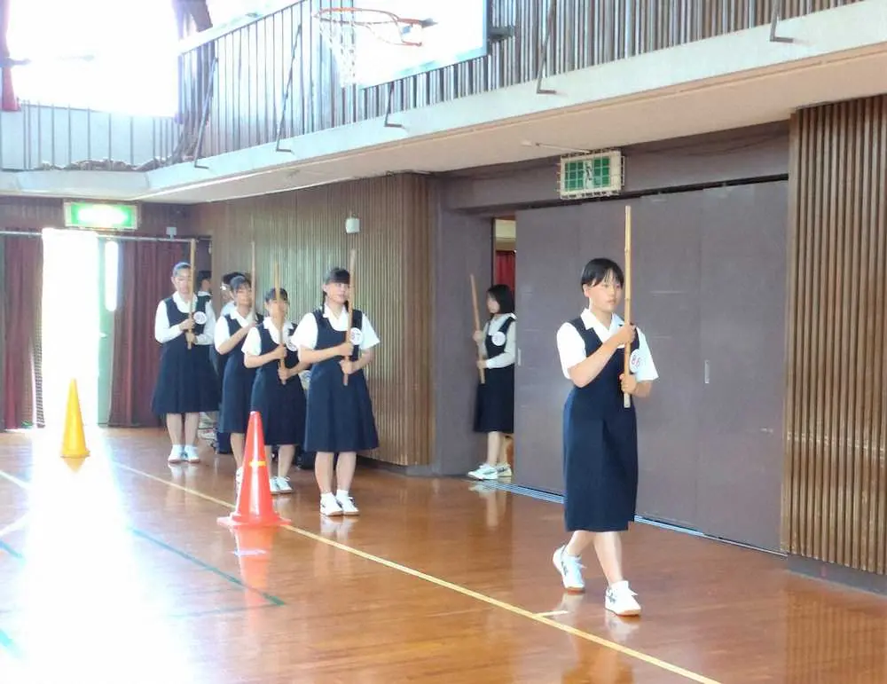 対象の2年生女子生徒全159人のうち118人が応募。欠席2人を除く116人が大会行進曲に合わせ、プラカード代わりの竹棒を手に体育館を1周歩いた。緊張感が漂うなか、体育教諭6人が選考にあたった。