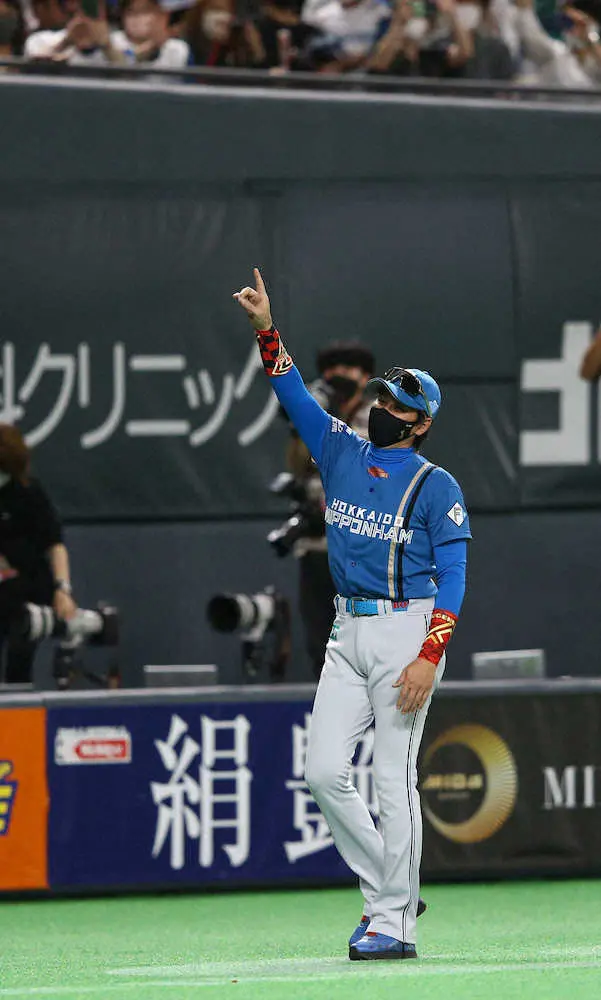 <日・西>スタンドのファンに手を振る新庄監督(撮影・高橋茂夫)