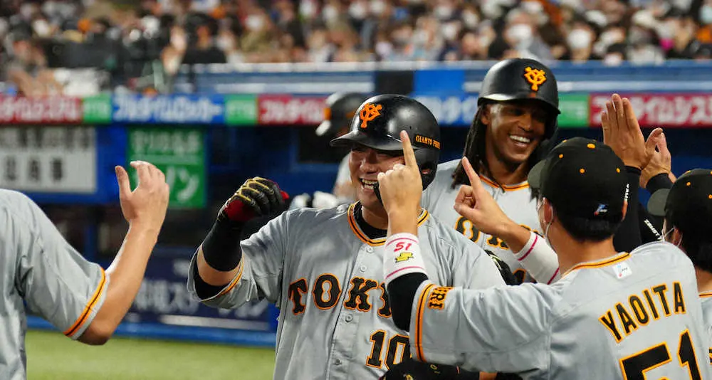<ヤ・巨>9回、勝ち越し2ランの丸(8)らを迎える原監督(左から2人目)=撮影・村上 大輔 Photo by スポニチ 巨人 神宮の仁義なき打ち合い再戦、初戦を10―8で制す 先月は3戦で両軍合… ギャラリーで見る この記事のフォト 2022年07月18日の画像一覧 もっと見る 2022年07月18日の画像をもっと見る