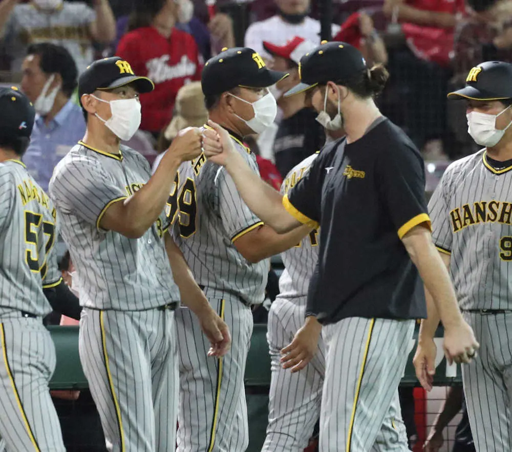 <広・神>広島に勝利し、ウィルカーソン(右)とグータッチをする矢野監督(撮影・平嶋 理子)