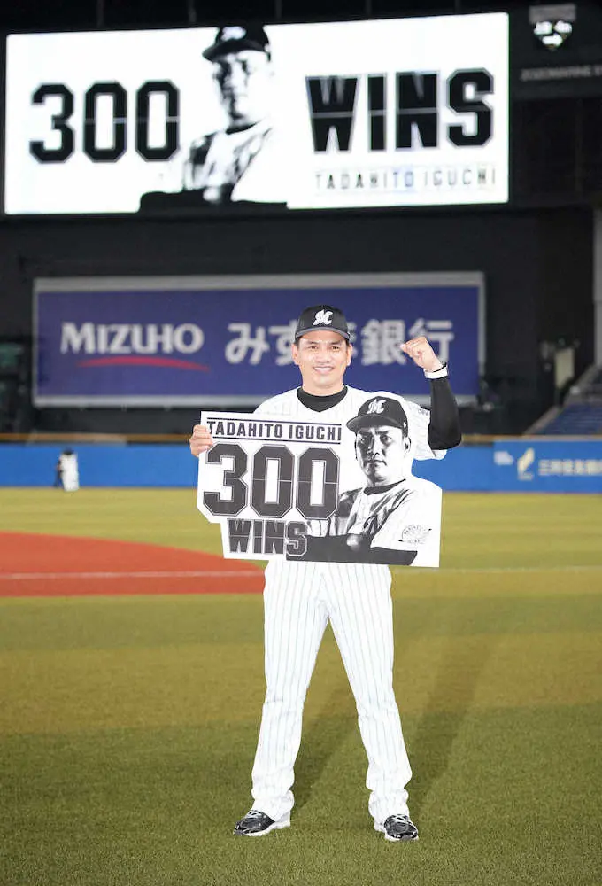 ロッテ・井口監督はちょっと照れたようにメモリアルボードを掲げた。就任5年目で球団史上7人目となる通算300勝だ。