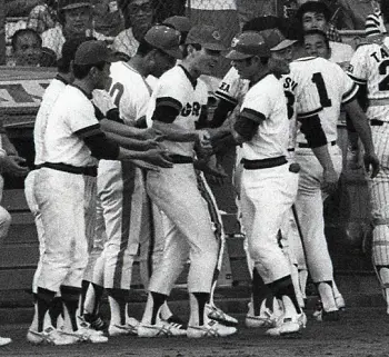 3回は少し苦しんだ。小兵の阪本敏三(阪急)を見逃し三振。岡村浩二(阪急)を空振り三振。あと1人。「よしやってやる」。江夏が燃えた。加藤秀司(阪急)カウント1―1からバックネット方向へファウルフライを打ち上げた。「追うな!」と江夏。最後は直球で空振り三振。偉業を達成した。