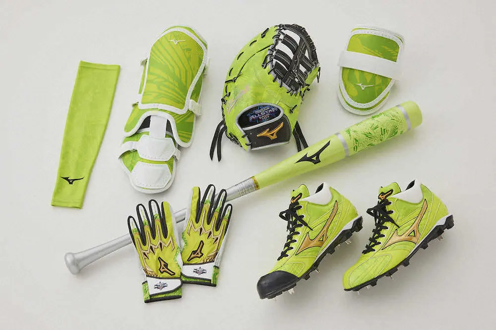 ブランドアンバサダー契約を結ぶミズノからは「未来を明るく照らす光」というイメージで、黄緑の「ネオライムカラー」のバットやグラブ、スパイクなどの用具が用意された。