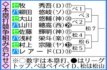 ▽球宴本塁打競争 両リーグ4人ずつの8人がトーナメント方式で対戦。2分間の球数無制限でホームラン数を競い、同点の場合は1分間の延長戦。延長戦でも同点の場合は(1)本塁打競争ファン投票の投票数、(2)今季の公式戦本塁打数、(3)昨季の公式戦本塁打数、の順で順位を決める。決勝で本塁打数0で同数の場合は引き分け。優勝賞金は100万円。また、7試合通して平均打球速度が最も速かった選手に日産サクラが贈られる。
