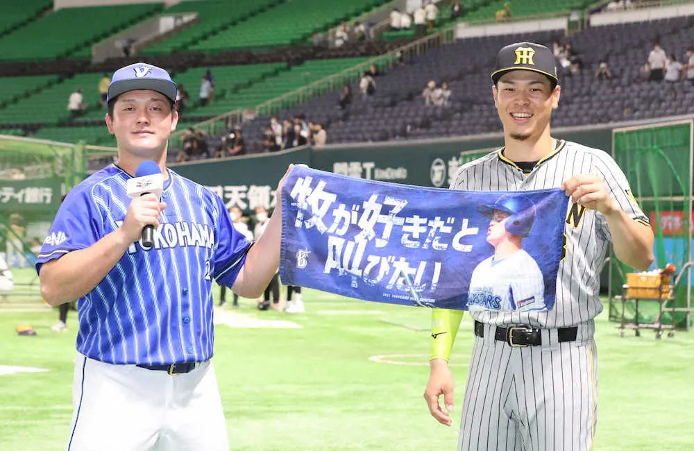 全セの阪神・佐藤輝とDeNA・牧の2年目コンビが、練習前のテレビインタビューで軽快な掛け合いを見せた。