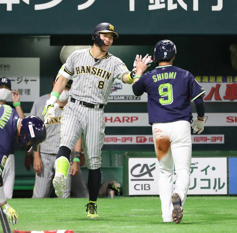 <全パ・全セ>初回、牧の犠飛で生還した塩見(右)を迎える佐藤輝(撮影・岡田 丈靖)