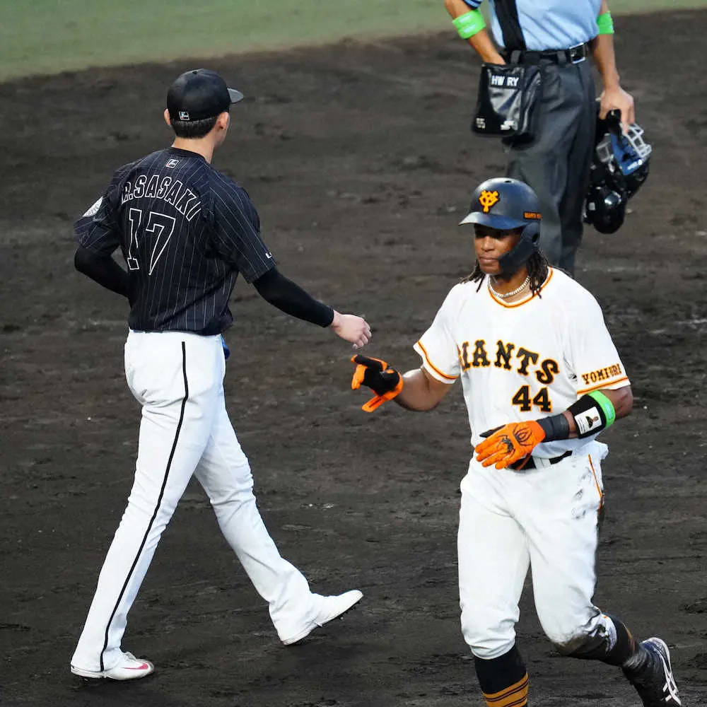 <全セ・全パ>初回、佐々木朗(左)から安打を放ち、佐藤輝の犠飛で生還したウォーカー(撮影・島崎忠彦)