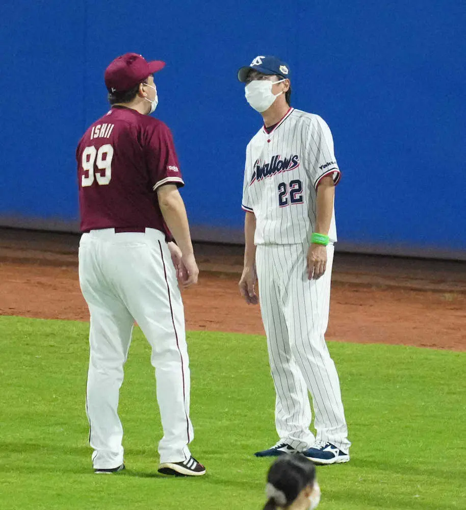 <全セ・全パ>試合後、石井監督(左)と話す高津監督(撮影・島崎忠彦)