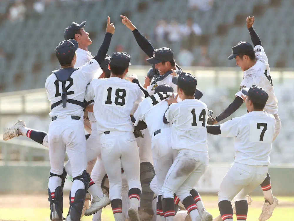 タイブレークに突入した延長13回に1点ずつを取り合い、迎えた延長14回。1死二、三塁で「3番遊撃」の福谷宇楽(うた=3年)が右前へ勝ち越しの2点適時打。さらに2死二、三塁と攻め立て、「6番一塁」の勝股優太(3年)が右前適時打を放って計3点を挙げた。その裏をエース右腕の芝本琳平(3年)が無失点にしのいで、歓喜の瞬間を迎えた。