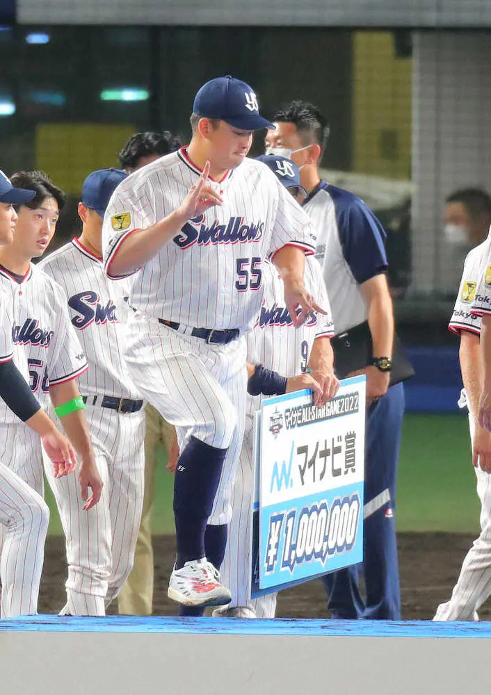 飛躍のきっかけとなった場所で躍動した。全セのヤクルト・村上が、対戦を熱望していた剛腕2人から連続安打。球界を代表する4番にまで急成長を遂げた姿を松山のファンに届け、敢闘選手賞とマイナビ賞を受賞して合計200万円をゲットした。