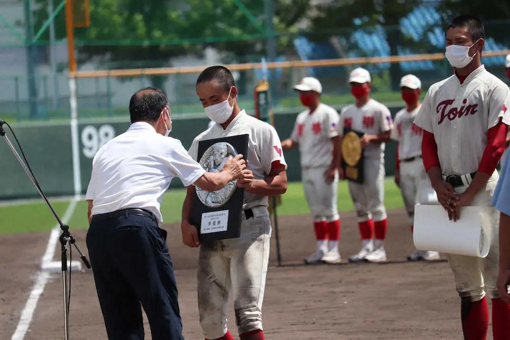 「調子は良かった。いけるところまでいく、と監督さんと話していた」と、先発右腕、背番号「5」の高野東我(とわ=3年)が再三のピンチにも粘り強く投げた。5回まで毎回安打を浴びながら失点は2回表、青山達史(2年)に浴びたソロ本塁打の1点だけだった。